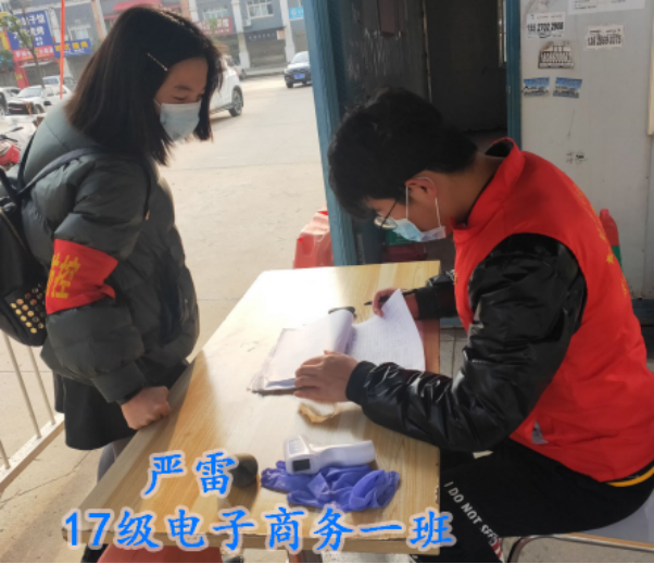 17级电子商务六班熊学娇家住在湖北省襄阳市枣阳南城惠岗环建小区,在年前1月22号实习放假回家后进行20天自我隔离,在期间了解疫情严重,社区每天工作量较大,解除隔离的她也加入到这场没有硝烟的战火中,每天统计社区楼栋每户居民的体温是否正常,及时准确的报给社区主任