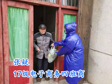 17级电子商务四班商张疑在社区内巡回宣传“戴口罩、少出门、少聚集"等防疫知识, 让居民上午下午各测量一遍体温,确保他们出现任何的异常我们都能够及时发现,同时给居民送上必备的生活物资,尤其是孤寡老人,更会送上水果蔬菜等食物,确保他们足不出户也能吃上新鲜的食物。