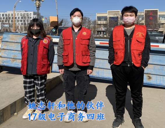 17级电子商务四班姚志轩同学家住在河北省邢台市河古庙镇瑞兴公寓社区的,了解自己的家乡需要志愿者,主动请缨出战,负责配
