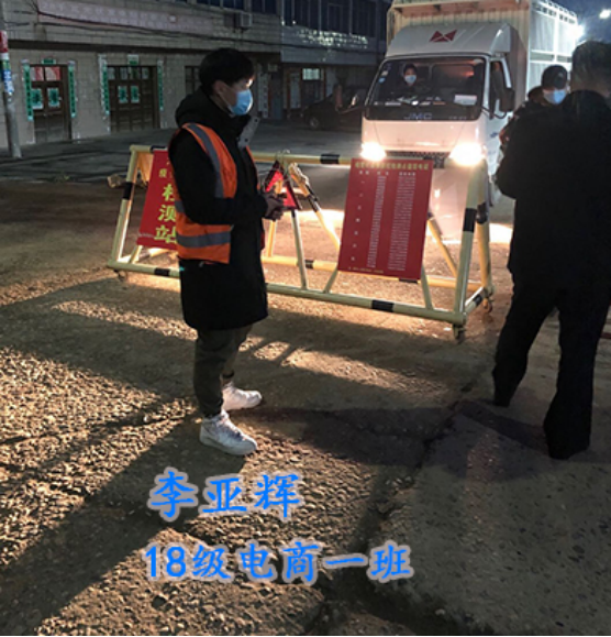 18级电子商务一班的李亚辉同学家住在湖北省襄阳市襄州区龙王镇柏营村,因为这次疫情的严重性,他们老家这边防控人手紧缺。他说:“作为一名当代大学生,虽不像一线医护人员那样坚守岗位,抗击疫情,但我也希望能做一些有意义的事情帮助别人,特别是那些需要帮助的人,所以我就参加了志愿者,为国家,为社会做点贡献,最后,祝福武汉,祝福襄阳,祝福中国,春天一定会来临的!”