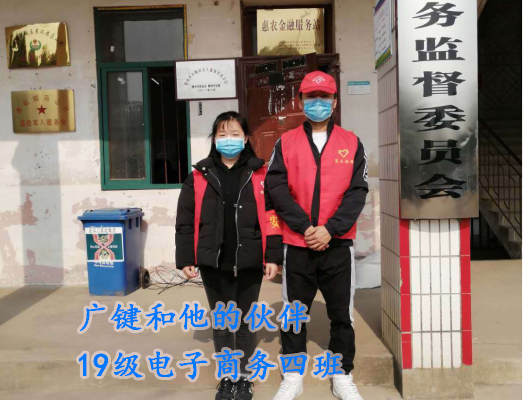 19级电子商务三班广键家住在湖北省鄂州市马山村的,在家多天每天都在实时关注新型冠状病毒的新闻,听说自己村里根本就没有志愿者,他就自己请缨出战,负责村里配送物资。