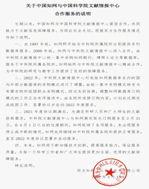 12.4月19日,遭中科院停用后,知网发布情况说明:将继续向中科院所属各院所提供正常。