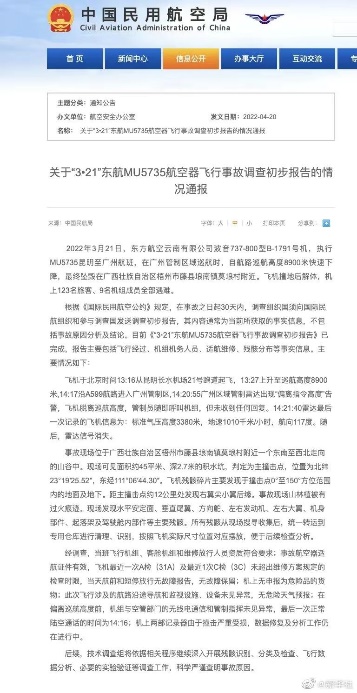 22.民航局发布东航飞行事故初步报告:关于“3•21”东航MU5735航空器飞行事故调查初步报告的情况通报。