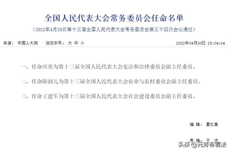 23.4月20日,全国人民代表大会常务委员会任命名单发布。