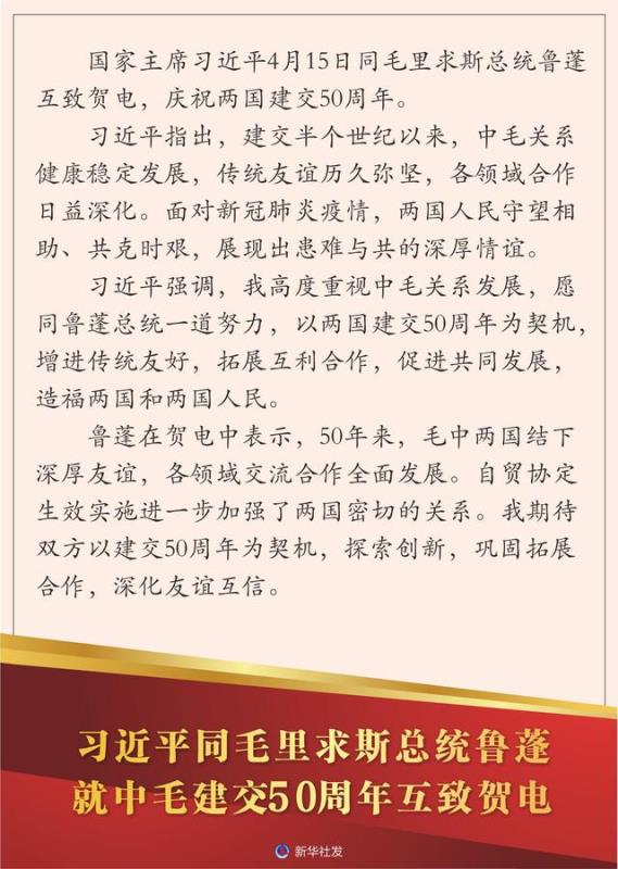 33.国家主席习近平15日同毛里求斯总统鲁蓬互致贺电,庆祝两国建交50周年。