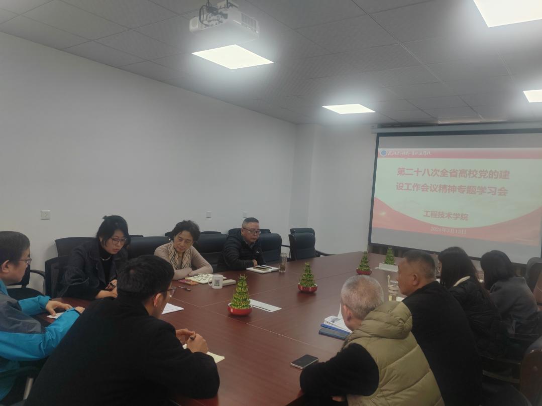 (通讯员 杨维)3月13日下午13:00,工程技术学院在办公楼302会议室组织召开第二十八次全省高校党的建设工作会议精神专题学习会。会议由学院副书记杨佩主持,学院院长熊祖钊、教学副院长夏丽君以及各系主任、专业负责人等参加了此次学习会。