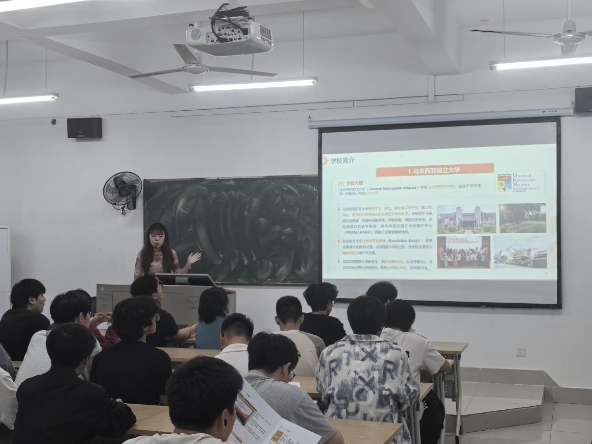 (通讯员 杨维)为助力工程技术学院学生拓宽升学视野,深度挖掘国际化教育资源,4月8日晚19:00,工程技术学院精心筹备并举办了马来西亚国立大学项目班宣讲会。来自2023级、2024级各专业的100余名学生齐聚一堂,共同探索国际化升学新路径,现场氛围热烈非凡。