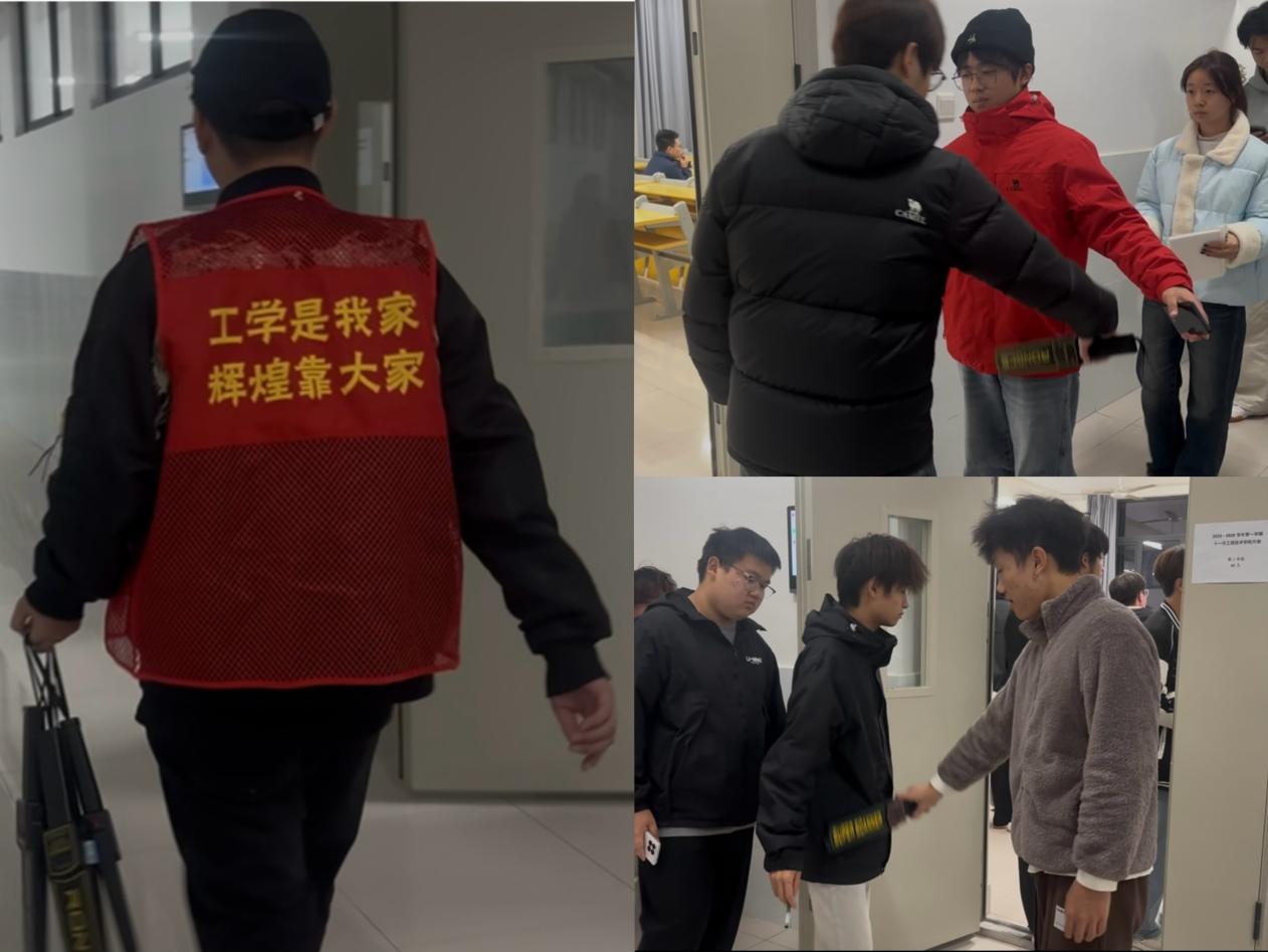 人员保障方面,40余名考务工作人员从24级优秀学生骨干中通过志愿报名选拔产生,经考前培训后,承担考场引导、设备协助、秩序维护及直播设备巡检等工作,及时处理画面卡顿、声音异常等问题,全力保障“云监考”顺利推进。25级全体辅导员以巡考身份穿梭各楼层考场,既实时监督考试纪律、处理突发情况,也通过直播镜头向家长传递“公平、严肃、规范”的考试氛围。