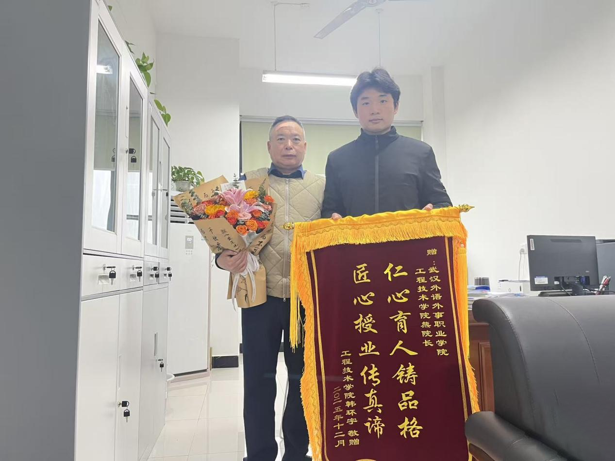 (通讯员 熊凯峰)近日,湖北省“工匠杯”职业技能大赛传来喜讯,我院具身智能与光电技术学院学子韩环宇荣获电梯组装赛道省级一等奖。赛后,韩环宇专程向指导老师熊院长敬赠锦旗与鲜花,表达诚挚感谢。