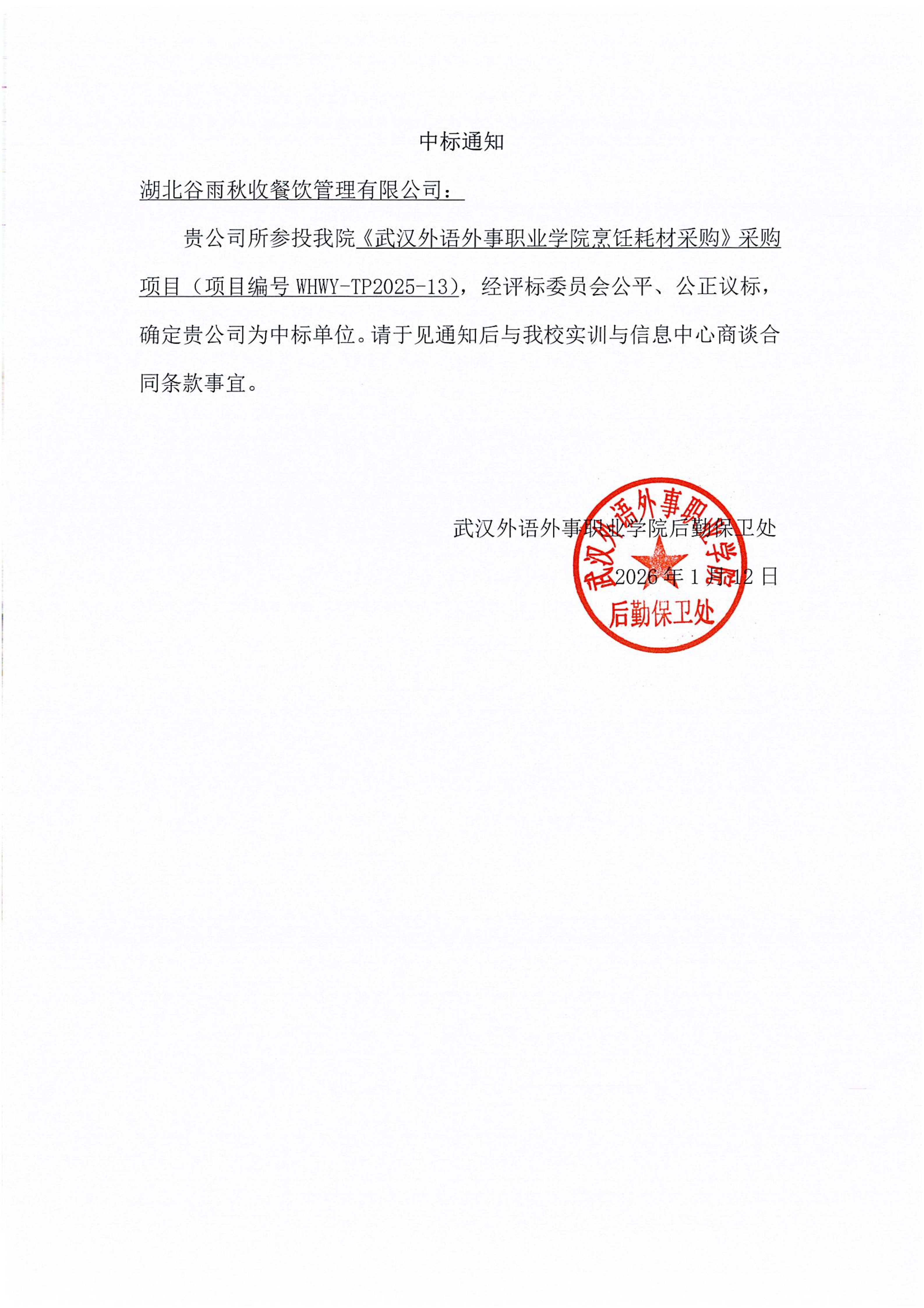 《武汉外语外事职业学院烹饪耗材采购》 (项目编号 WHWY-TP2025-13)中标通知