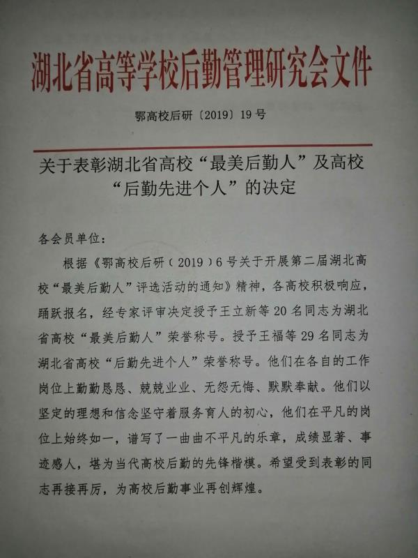 湖北省高校后勤研究会从2019年6月开始在全省范围内开展了第二届湖北高校“最美后勤人”评选宣传活动,以巩固高校后勤改革成果,展示湖北高校后勤风采,讴歌后勤先进模范,向建国70周年献礼。通过学校推荐、材料申报、专家评审等环节,最终全省共评选出20名“最美后勤人”、29名“后勤先进个人”。