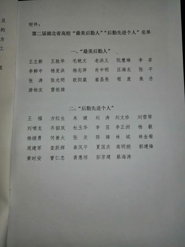 新闻网讯(通讯员皮芳)日前,湖北省教育厅高校后勤研究会在全省高校开展的“最美后勤人”评选活动结果公布,我院后勤集团公寓中心经理李鲜中、水电管理中心运行主管游柏友荣获湖北省高校“最美后勤人”称号。