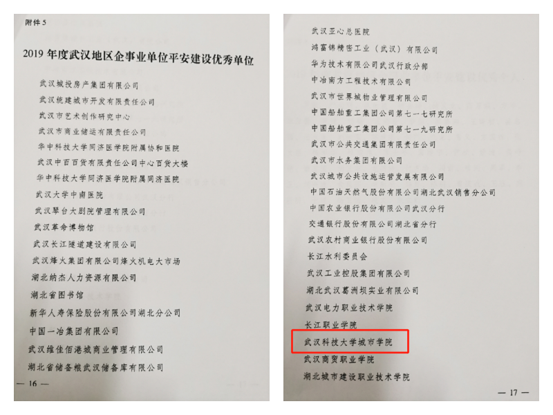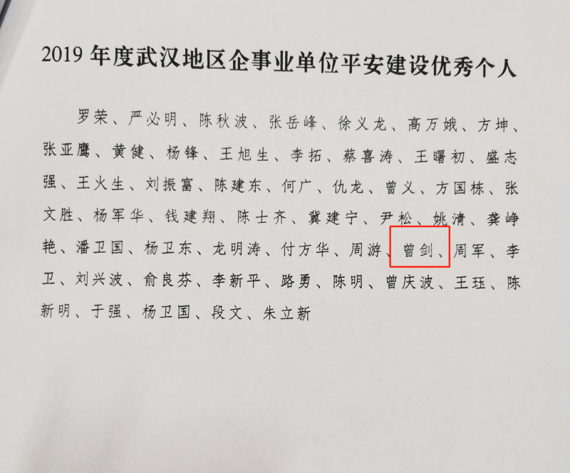 新闻网讯(通讯员皮芳)近日,中共武汉市委政法委员会通报了2019年度全市平安建设检查考评工作情况,我院荣获2019年度武汉地区企事业单位平安建设优秀单位荣誉称号,后勤集团副总经理曾剑同志荣获2019年度武汉地区企事业单位平安建设优秀个人荣誉称号。