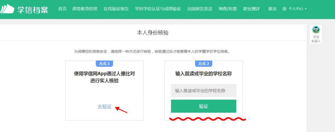6、进入学籍板块后,由以下两种方式中,选择其中一种,进行身份核验。
