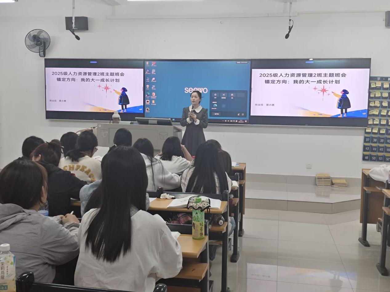 新闻网讯(通讯员 莫小惠) 金秋送爽启新程,逐梦青春正当时。为帮助2025级人力资源管理2班新生快速适应大学生活、明确成长目标、找准发展方向,2025年9月24日,以“锚定方向,我的大一成长计划”为主题的首次班会在3号教学楼323教室温情启幕。班主任莫小惠老师与全班35名新生齐聚一堂,共话成长、共绘蓝图,为崭新的大学生涯按下“启动键”。