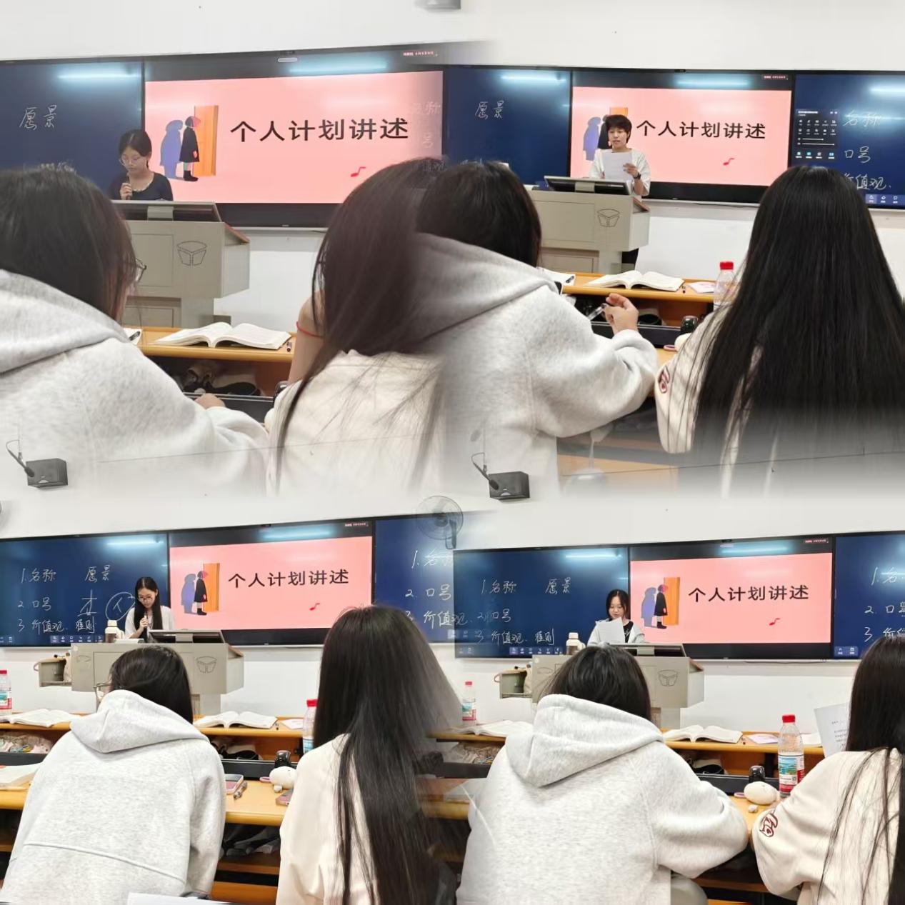 还有不少新生将“个人成长”与“专业特色”结合,展现出清晰的职业意识。有同学提出大一要做好“职业认知储备”:“我打算每季度读1本HR相关书籍,比如《聘谁》《拆掉思维里的墙》,同时关注‘人力资源分享汇’等公众号,了解行业最新动态;周末有空会去附近的企业园区观察,看看真实的HR日常工作是什么样的,慢慢明确自己以后想深耕的人力模块,比如薪酬福利或者员工关系。”同学们的分享或务实具体,或富有远见,赢得了阵阵掌声。班主任逐一点评了每位同学的计划,在肯定亮点的同时,也给出了调整建议:例如,提醒计划考证的同学合理分配时间,避免贪多求全;建议侧重实践的同学平衡好社团活动与专业学习,确保二者相得益彰。这些建议使新生的计划更具可行性。