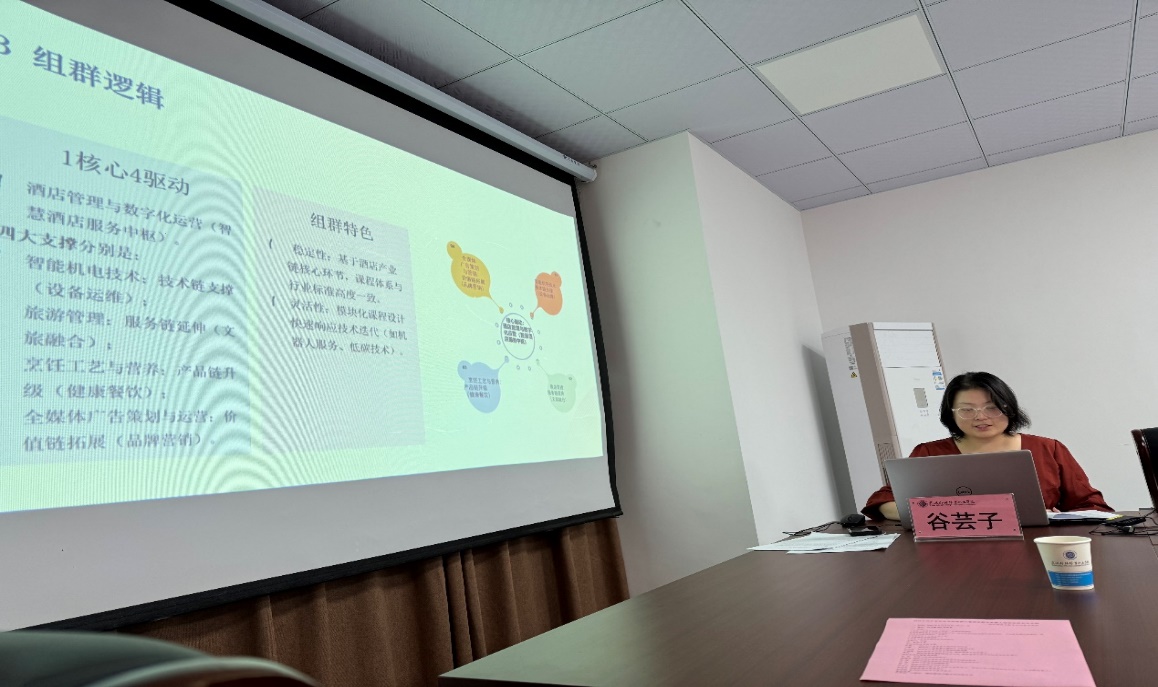 随后酒店管理专业群负责人谷芸子老师和国际商旅服务专业群负责人梁川飞老师分别介绍了各专业群中所包含的各个专业的人才培养方案,重点介绍组群专业如何通过资源共享、岗课赛证创融通等方式,共同支撑专业群的发展。