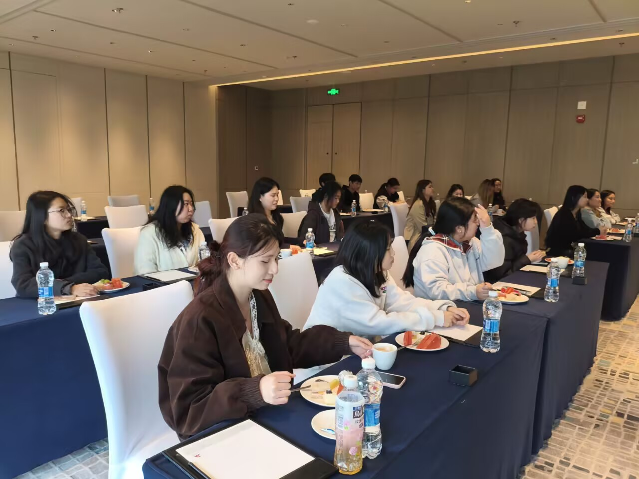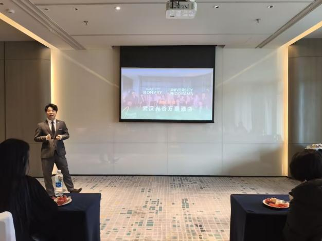 随后,师生移步会议室开展交流分享。同学们一边品尝酒店精心准备的精美甜点,一边认真聆听人事经理系统介绍万豪品牌文化、人才培养体系、实习岗位设置与职业晋升通道,在轻松温馨的氛围中加深对企业与行业的认知。