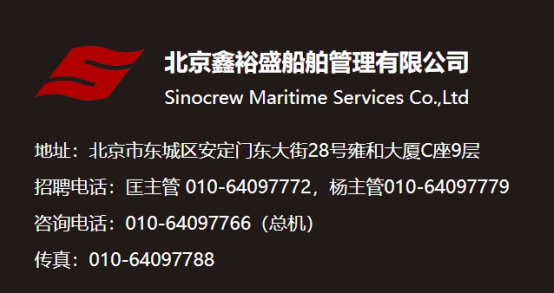 北京鑫裕盛船舶管理有限公司(SinocrewMaritime Services Co.,Ltd.)是一家为国际航运业提供综合船员管理和海事培训服务的领先供应商,在国内引领着提供最安全、最优质的中国船员国际化发展道路。主营业务: 国际海事人力资源的教育、培训、招聘、就业、管理、派遣,终身价值服务商。我们拥有超过 14,000 名专业海员的人才库,并在 16 个办公室全面管理 200 多艘船舶,充分展示了我们的雄厚实力,使我们成为船东寻求高质量中国海员解决方案的理想合作伙伴。