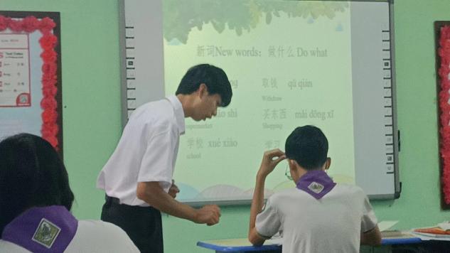 肖淼和杨子轩作为中文老师,不仅教泰国学生汉语知识,还利用部分课前时间为学生开展了太极拳的展示及教学活动,将中华优秀传统文化融入课堂。首先他们在学校大礼堂向学生们展示他们在国内精心学习、准备的太极拳,动作柔和缓慢、连贯圆滑,学生们也被深深吸引,看得聚精会神。展示结束后利用课前时间在教室为学生们教授了太极拳的打法,肖淼在教室前方一步一步地展示着,学生们则在自己的座位旁仔细地学着肖淼的动作,露出充满好奇又兴奋的表情,杨子轩在台下帮助学生纠正动作,让学生们的动作更加标准。