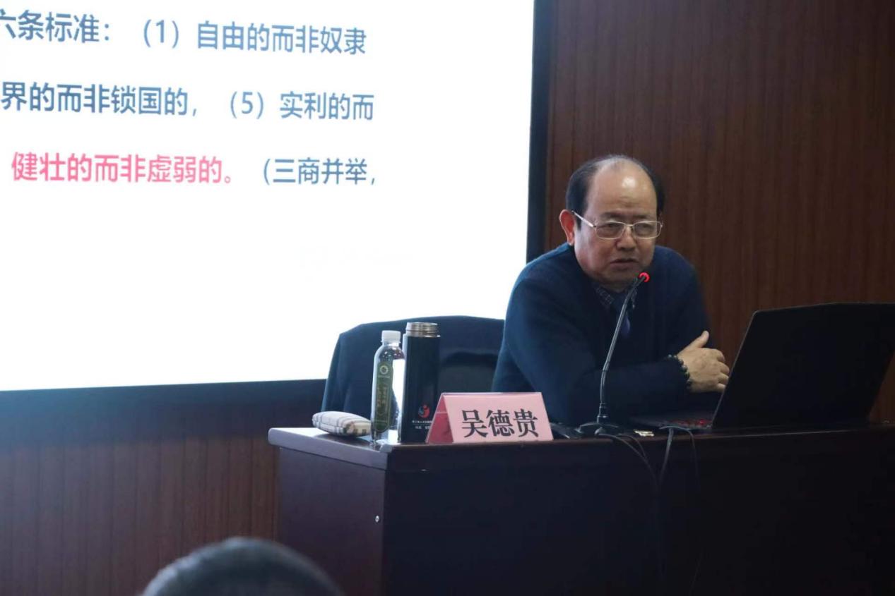 专题报告会上,吴德贵教授以《青年才俊的知识武装与能力建设》为题,从充分认识青年才俊的使命担当、深刻理解习总书记的讲话内涵、努力成为堪当大任的国之栋梁等方面对学习贯彻好习近平总书记关于年轻干部成长的系列重要讲话精神进行全面系统的阐述。吴德贵教授以深入浅出的方式,从多个角度对习近平总书记论中青年干部成长思想进行了全面解读。报告内容涵盖了干部人才、领导力建设、时事政治和特色分享等方面,不仅对顶层制度建设包括中国干部人事制度改革、职业道德建设、中国人才发展战略研究、人才发展体质机制改革研究、人才强国战略研究进行了详尽分析,还贯穿习近平新时代人才思想、习近平新时代选人用人思想、科学人才观、人才成长规律、大学生成才路径以及领导干部学习力、领导艺术等重要议题,为干部成长提供了极大的帮助,激励干部加强知识武装和能力建设,明确使命担当,充分施展才华,踔厉奋发、笃行不怠,为推进新时代中国特色社会主义伟大事业、实现中华民族伟大复兴的中国梦努力贡献智慧和力量。