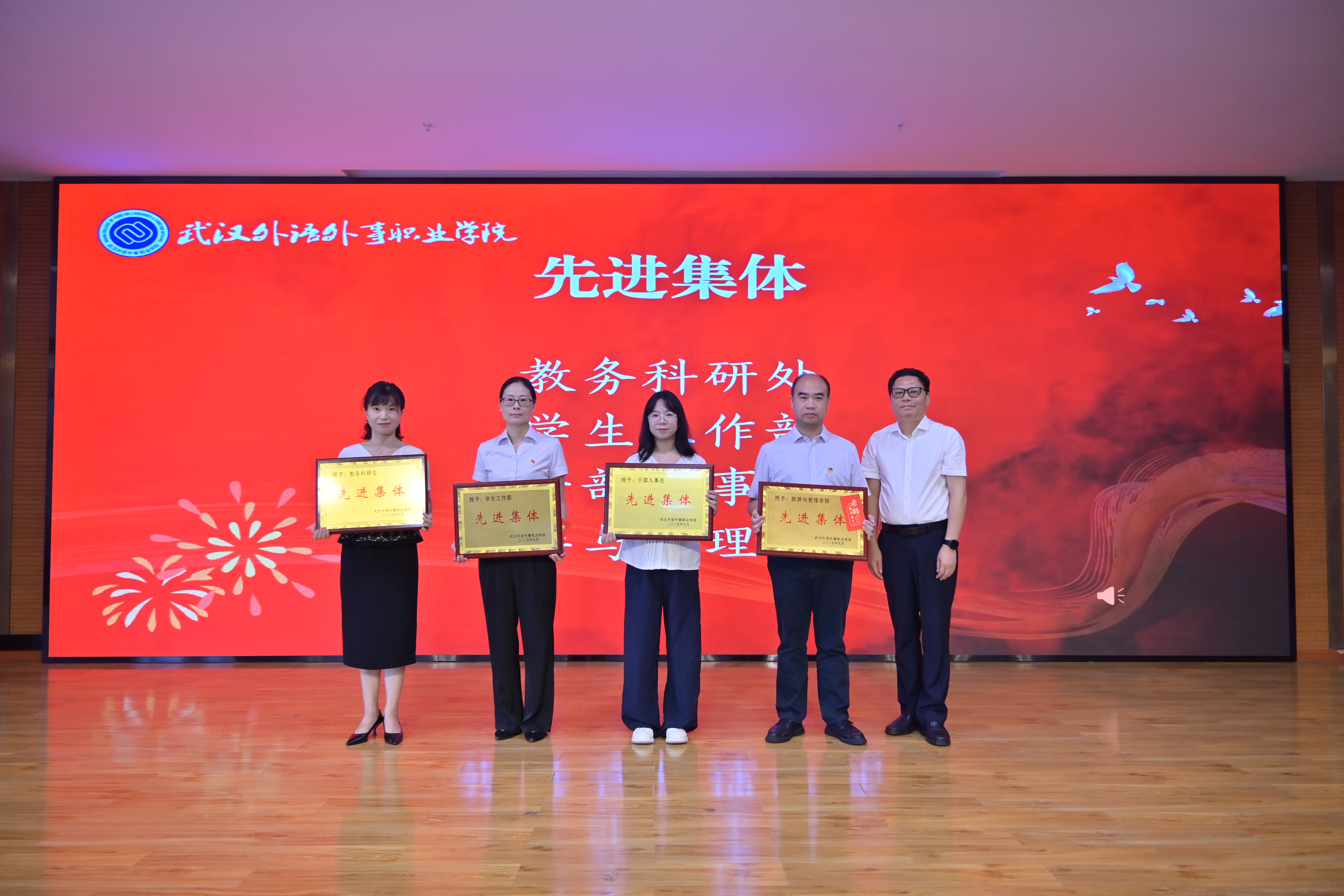 副校长刘汛汛宣读《武汉外语外事职业学院关于表彰2024-2025学年先进集体和先进个人的决定》,授予教务科研处等4个单位“先进集体”荣誉称号;授予梁川飞等5人“师德先进个人”荣誉称号;授予施卫荣等16人“优秀教育工作者”荣誉称号;授予国燕萍等23人“优秀教师”荣誉称号;授予张凤军等7人“优秀辅导员”荣誉称号,并对获奖单位和个人分别颁发牌匾、荣誉证书等。