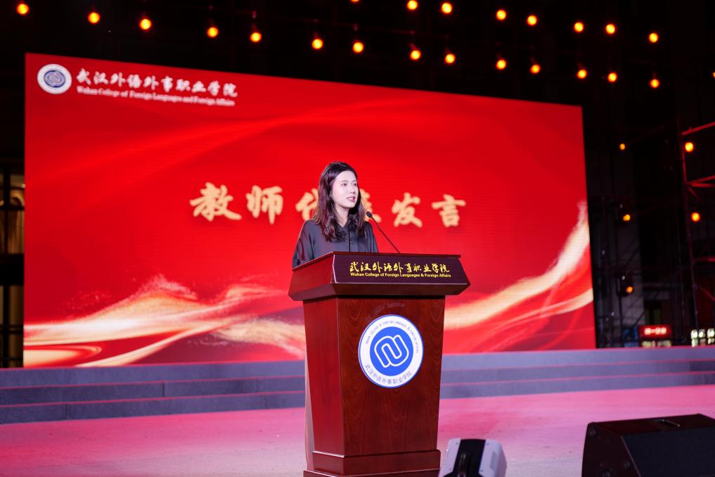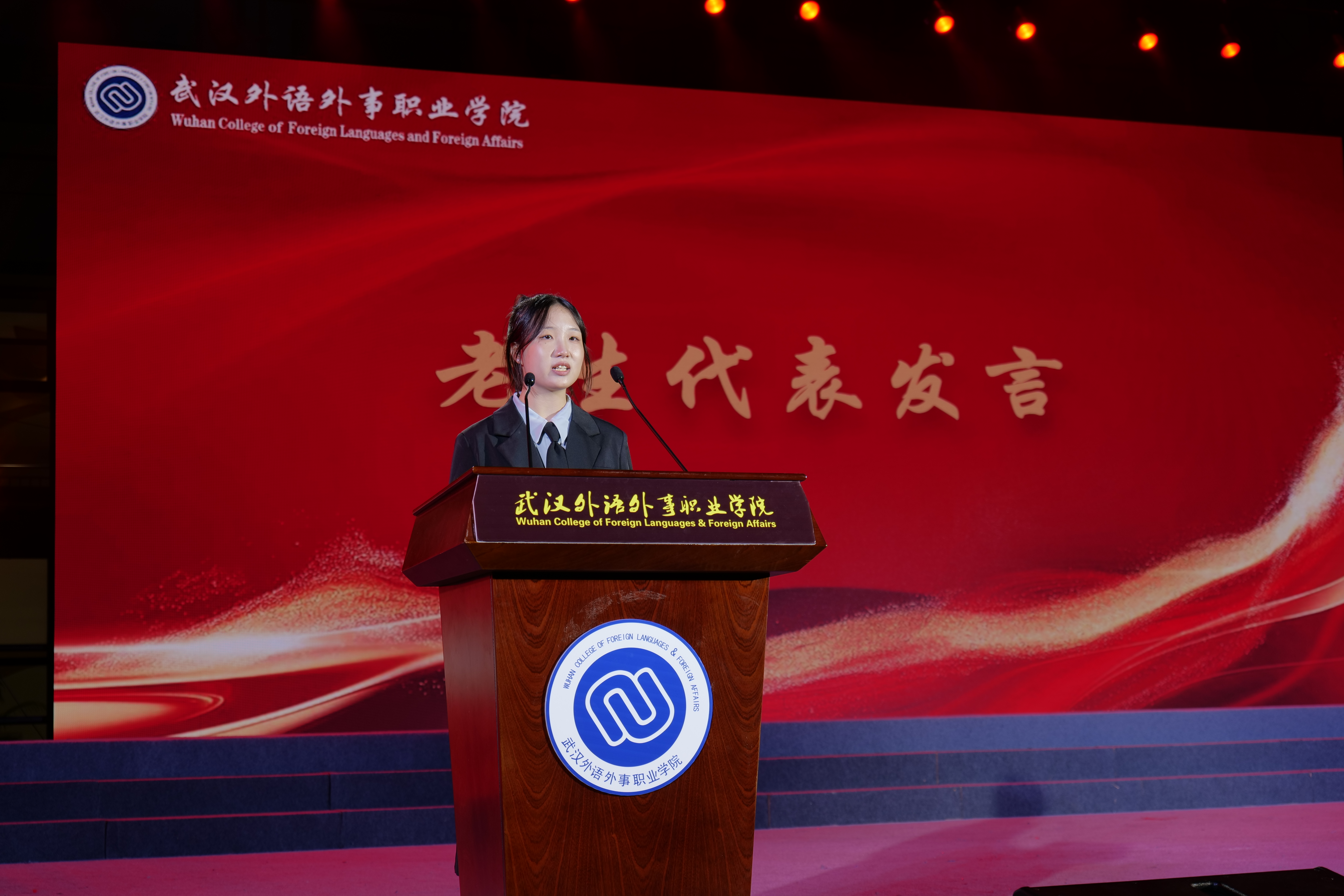 外语与艺术学院2025级学生周思雨作为新生代表发言,她表达了对大学生活的憧憬与誓言。她表示,将珍惜大学时光,保持好奇心,探索欲,努力学习专业知识,积极参与社会实践与志愿服务等活动,与良师益友携手共进。她号召全体新生主动规划、勇敢探索、团结协作,肩负起时代赋予的使命。“请学长学姐们放心,我们会传承你们的优良学风、作风,专心学习、主动实践,让一届届的外院学子们多走坦途,少走弯路;请老师们放心,我们会遵规守纪,主动探索,在知识的海洋里无限遨游;请学校放心,我们会牢记“厚德、笃学、求实、创新的校训,砥砺前行,请相信,强校有我们;请家长们放心,我们在外院挺好的”!周思雨用四个放心代表2025级新生做出了庄严承诺,引起现场阵阵共鸣,相信2025级新生们定会用坚持与探索在武汉外语外事职业学院书写无悔的青春华章。