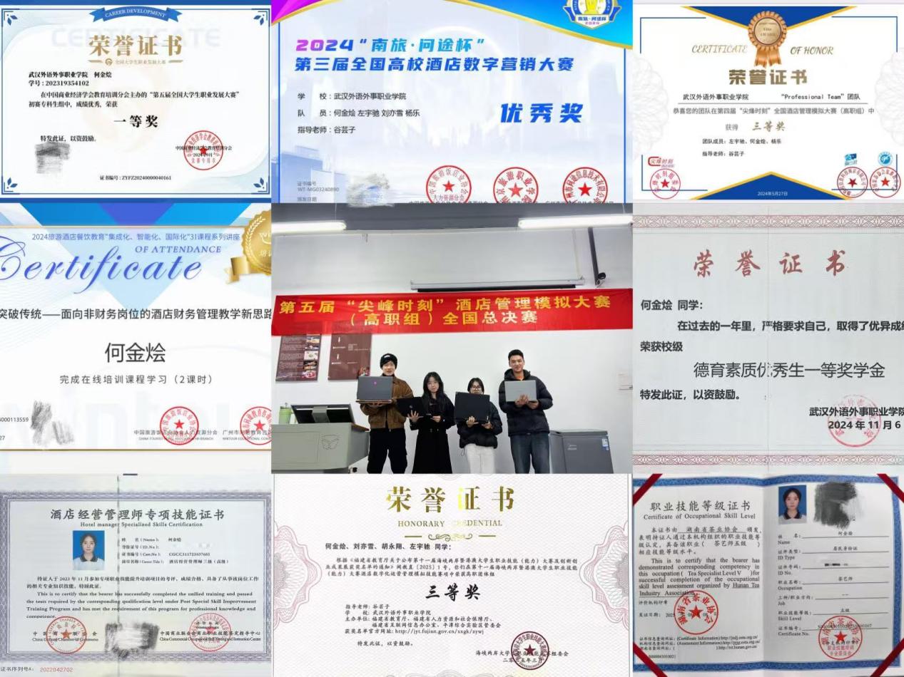 清晰的规划是何金烩稳步前行的关键。入学之初,她就确立了“专业深耕+实践落地”的核心目标,并根据成长节奏动态调整方向。大一阶段,她专注夯实专业基础,高质量完成酒店管理核心课程学习;随后主动竞选学习委员,在服务同学中提升组织协调能力;大三起,她将重心转向技能提升与赛事备战,不仅在专业竞赛中崭露头角,还先后考取酒店管理师、茶艺师、心理指导师等多项资格证书,让自己的履历更加厚重。