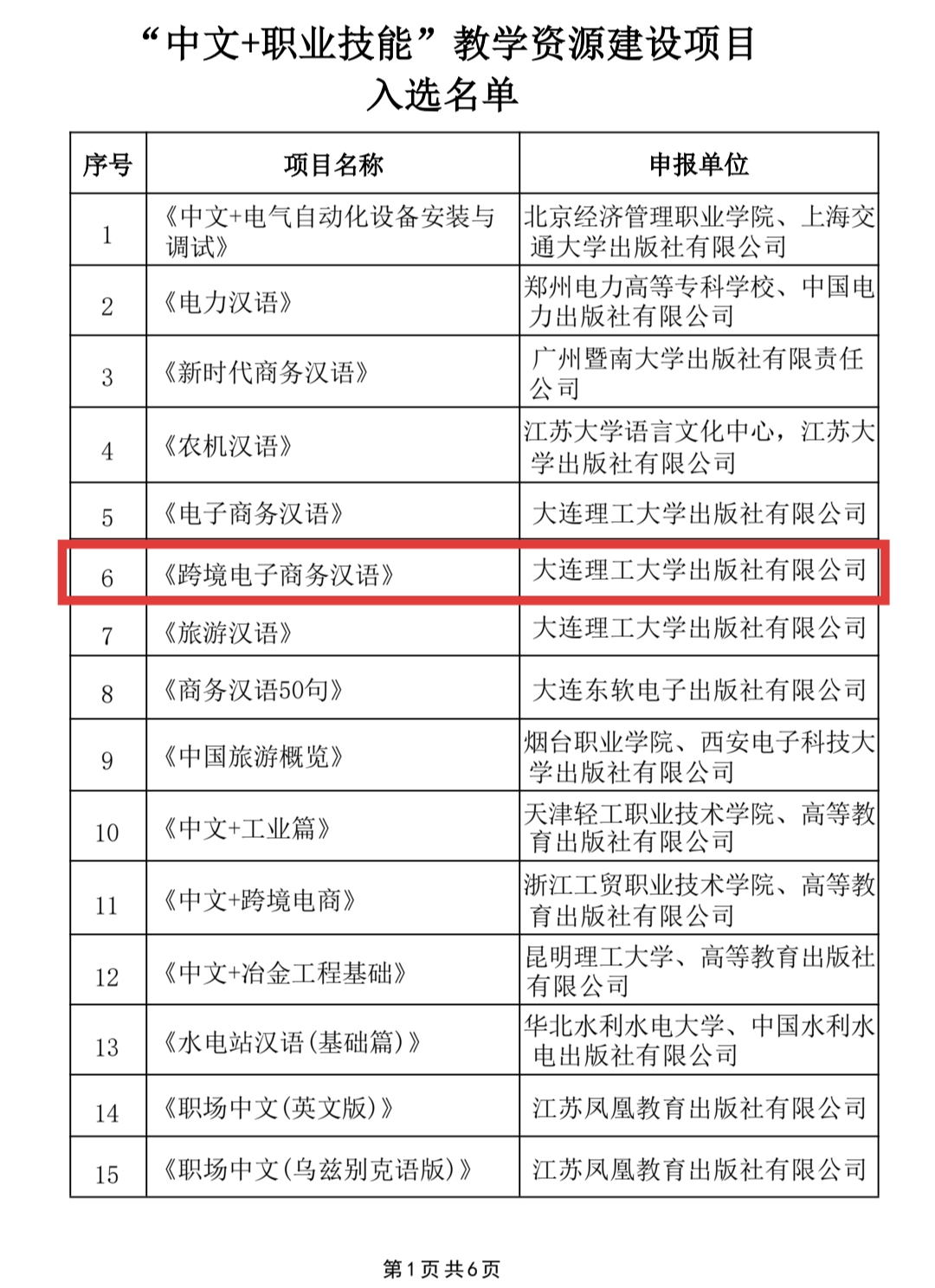 新闻网讯(通讯员 王波)近日,教育部中外语言交流合作中心“中文+职业技能”教学资源建设项目遴选结果正式公布,由常州机电职业技术学院主编,武汉外语外事职业学院与郑州职业技术学院联合参编的优质教材《跨境电子商务汉语》从全国186个申报项目中脱颖而出,历经严格材料审核与权威专家评议,成功入选该国家级重点教学资源建设项目,为职业教育国际化发展、“中文+职业技能”融合育人注入强劲动力。
