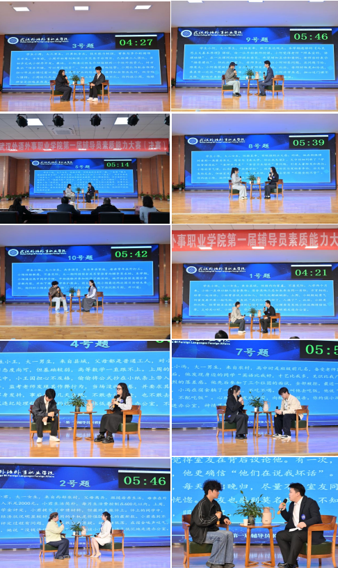 决赛设置案例研讨、谈心谈话两大核心环节,聚焦学生日常管理、学业困惑、心理疏导、宿舍矛盾、实习维权、创业抉择、宗教防范等真实工作场景,全面考