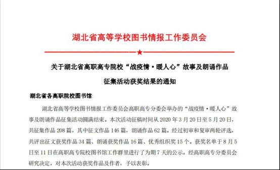 2020年新冠肺炎疫情打乱了所有人的生活节奏,为增强师生抗疫的信心,温暖读者的心,湖北省高等学校图书情报工作委员会高职高专分委会特举办“战疫情·暖人心”故事及朗诵作品征集活动。该活动自3月份在全省启动以来,历时两个多月,共评出征文获奖作品 34 篇、朗诵获奖作品 16 篇、优秀组织奖 15 个。