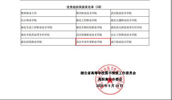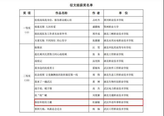 新闻网讯(通讯员王小璐)近日,从湖北省高等学校图书情报工作委员会传来喜讯,我院学子杜丽敏的作品《相信年轻的力量》荣获湖北省“战疫情·暖人心”故事及朗诵比赛征文组二等奖,我院图书馆获得优秀组织奖。