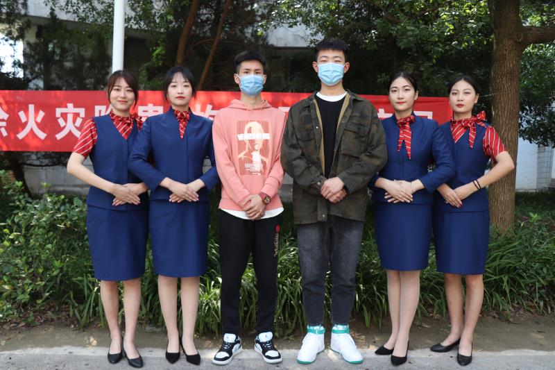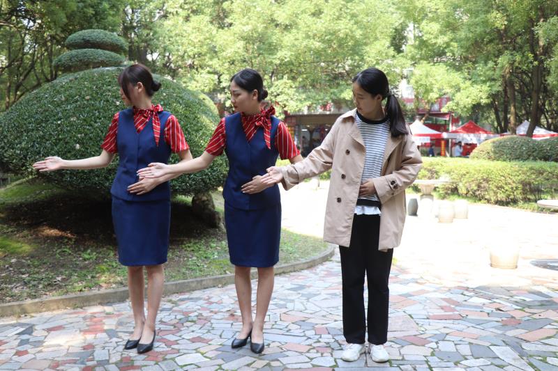 4名女生是旅游与管理学部2019级高铁乘务专业学生邹郑璇、吴曾和空中乘务专业学生王欣、刘奕涵,为了能让报到的新生们更多地了解到这个专业,她们希望教给新生乘务基本礼仪,让新生们体验站姿、坐姿、引路手势等,感受特色鲜明的旅管学部素质高、形象佳、气质优的特点。