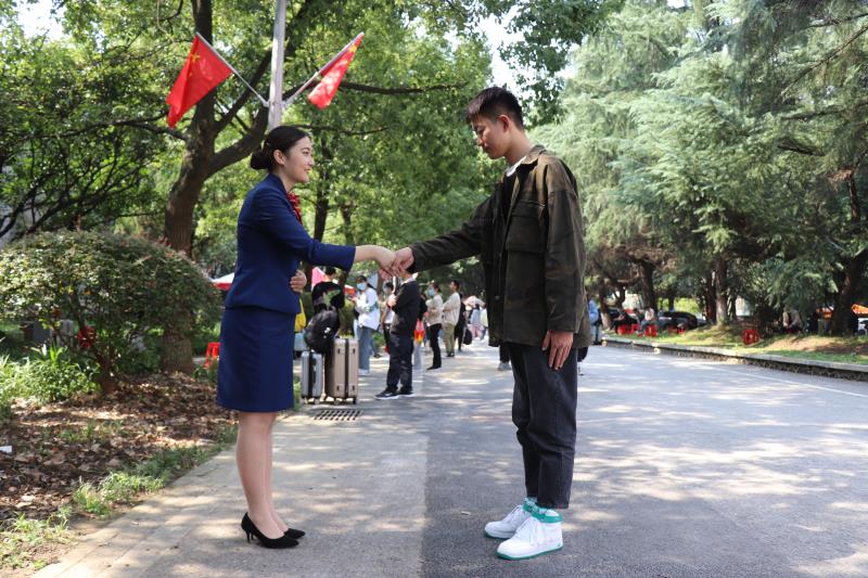 早上7点不到,她们就来到梨园校区迎新点,准备迎接新生的到来,这道靓丽的风景渐渐吸引了很多新生和新生家长驻足,大家跃跃欲试。2020级信息技术学部软件技术专业新生谢心怡体验后感慨:“这种活动非常有意思,我能感受到学姐们的专业素质很高,学到了一些基本乘务礼仪最后还能一起合影,我收获了入学后最珍贵的见面礼。”