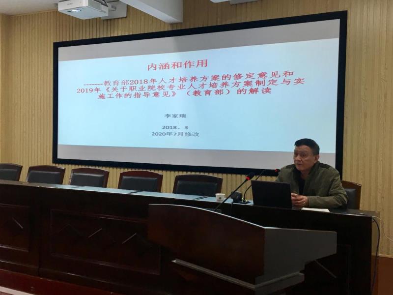 新闻网讯(通讯员李肖爽)10月28日下午,我院在行政楼A332会议室召开2020版人才培养方案修订培训会。学院副院长刘丹、各学部主任、公共课部主任、教学副主任、各专业负责人参加。会议由教务处处长张凤秦主持。 本次培训邀请教育部《高职高专院校人才培养工作水平评估专家库》成员、湖北长江教育研究院专家、原黄冈职业技术学院副院长李家瑞主讲。旨在进一步落实《中共中央办公厅国务院办公厅关于深化教育体制机制改革的意见》和《国务院关于加快发展现代职业教育的决定》,规范人才培养方案制订,全面提升人才培养质量。按照国务院《关于印发国家职业教育改革实施方案的通知》(国发〔2019〕4号)、教育部《关于职业院校专业人才培养方案制订与实施工作的指导意见》(教职成〔2019〕13号)和《关于组织做好职业院校专业人才培养方案制订与实施工作的通知》(教职成司函〔2019〕61号)等文件要求,进一步优化我院人才培养方案。
