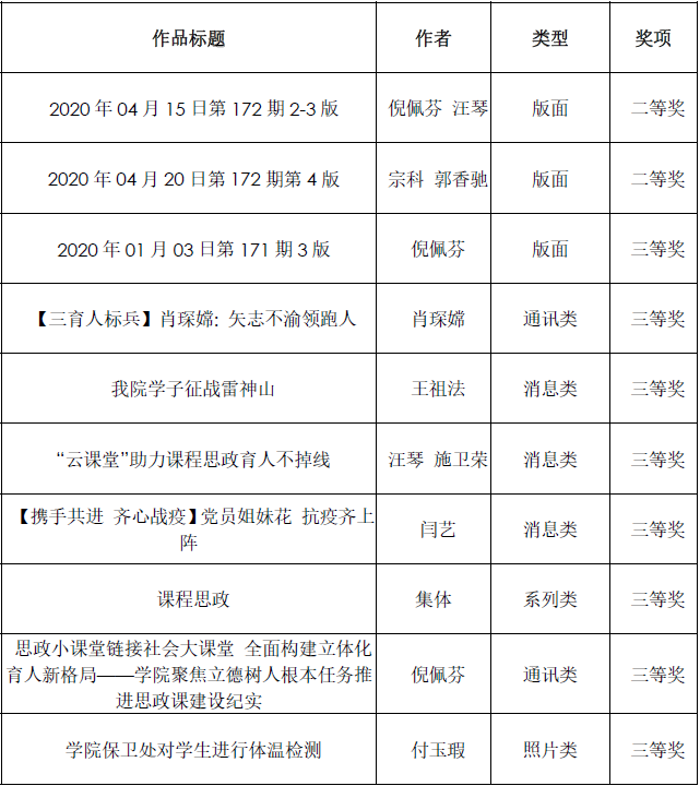 按本次参评要求,各高校从消息、通讯、言论、照片、版面、系列6个类别报送作品,我院报送了15件作品参加5个类别的评选,最终有10件作品获得奖项。其中,2020年4月15日校报2-3版(作者倪佩芬 汪琴)获版面类二等奖,2020年4月20日校报第4版(作者宗科 郭香驰)获版面类二等奖,此外,2020年1月3日校报第3版获版面类三等奖,三篇新闻作品获消息类三等奖,课程思政系列报道获系列类三等奖,两篇通讯稿获通讯类三等奖,一张照片获照片类三等奖。
