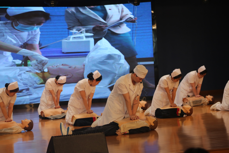 旅游与管理学部、医学部、应用外国语学部学生在会上展示了模拟乘务礼仪、导游服务、护理技能之心脏复苏、《Don’t forget your dream》英语演讲。