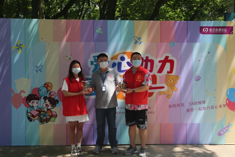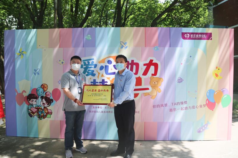 武汉血液中心招募科副主任王丹来到献血现场,代表武汉市献血办、武汉血液中心、同济医院儿科血液病房、协和医院儿科血液病房为我院颁发“凡人善举 善小而为”奖牌,为我院志愿者团队颁发 “凡人善举 善小而为”奖杯,感谢我院志愿者参与第二届“爱心助力·圆梦六一”活动。