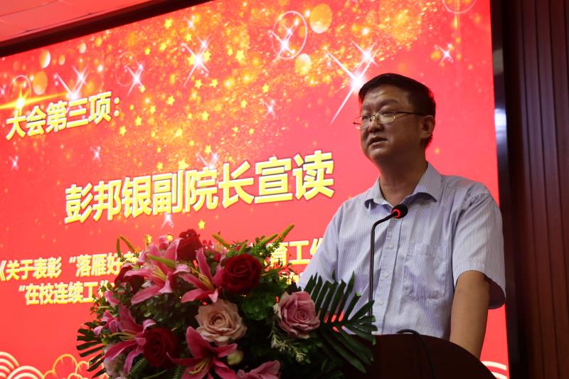 副院长彭邦银宣读《关于表彰“落雁好老师”“优秀教育工作者”“在校连续工作十年以上教职员工”的决定》。授予肖琛嫦等13人“落雁好老师”称号,授予邱莹等9人“优秀教育工作者”称号,表彰59名“在校连续工作十年以上教职员工”。
