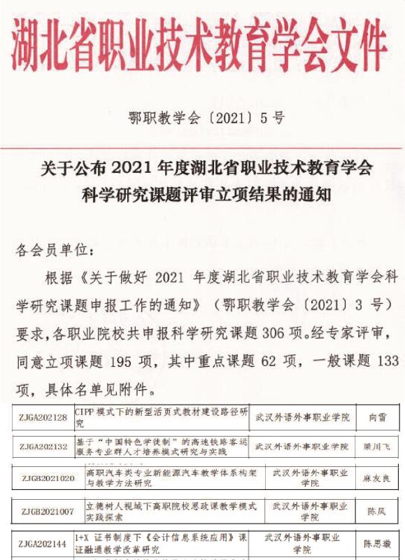 我院深入贯彻习近平总书记关于教育系列重要讲话精神,贯彻《国家职业教育改革实施方案》《中国教育现代化2035》等纲领性文件,坚持立德树人根本任务,全面研究职业教育人才培养各环节深层次、突出性的问题,根据《关于做好2021年度湖北省职业技术教育学会科学研究课题申报工作的通知》(鄂职教学会〔2021〕3号)文件精神,积极组织各学部教师申报,经教学指导委员会评审,按分配名额,遴选7项课题上报省职教学会。根据《关于公布2021年度湖北省职业技术教育学会科学研究课题评审立项结果的通知》(鄂职教学会〔2021〕5号)文件精神,向雪、梁川飞、陈思璇、陈凤、麻友良、吴哲6位教师主持的课题获批准立项,其中重点课题3项,一般课题3项。