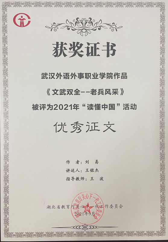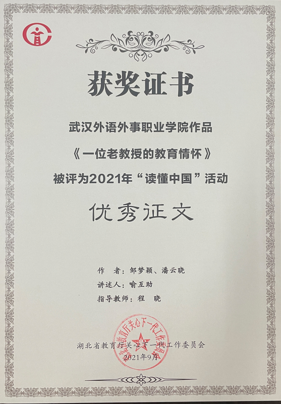 我院获奖征文《一位老教授的教育情怀》由教师喻互助讲述,学生邹梦颖、潘云晓撰写;《文武双全——老兵风采》由教师王铭杰讲述,学生刘易撰写。