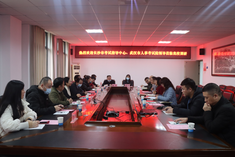 新闻网讯(通讯员 晏霞)12月15日上午,长沙市考试指导中心副主任舒浩、武汉市人事考试院副院长郭艳一行11人来我院,专题调研和交流人事考试组考工作。我院副院长赵光红出席,继续教育处和实验实训中心相关人员参加会议。会议由继续教育处处长胡兰兰主持。