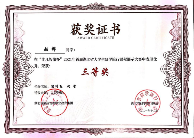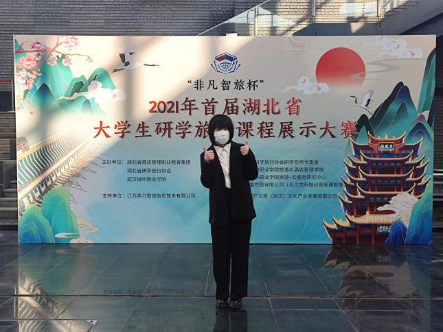 新闻网讯(通讯员祝晓春)12 ⽉ 3 ⽇,湖北省酒店管理职业教育集团、湖北省研学旅⾏协会、武汉城市职业学院共同主办的“⾮凡智旅杯”2021 年⾸届湖北省⼤学⽣研学旅⾏课程展示⼤赛在武汉园博园长江文明馆圆满落幕,我院2020级旅游管理专业学生李书涵在其教师祝晓春的指导下呈现的 《拥抱自然,为“艾”出发——李时珍博物馆》、2021级高铁专业学生颜娜在其教师梁川飞指导下展示的《品古诗、明信仰、访神兽——黄鹤楼诗词研学游》研学课程均获得三等奖的好成绩。