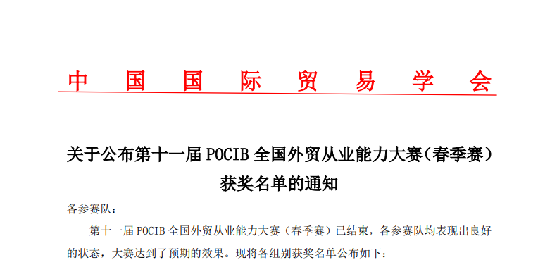 新闻网讯(通讯员 王晓宁 李昕)4月29日,第十一届POCIB全国外贸从业能力大赛(春季赛)落下帷幕。我院财经与商贸学部代表队荣获团体二等奖1项、个人三等奖5项(徐琛、杜阳、李梦华、梁海杨、汪晨婷)。