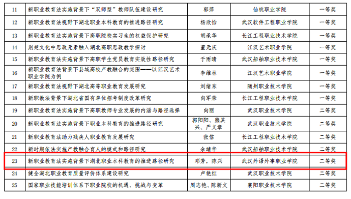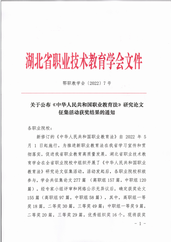 2022年5月1日,新修订的《中华人民共和国职业教育法》开始实施。为推动新职业教育法在湖北省学习宣传和贯彻落实,促进湖北省职业教育高质量发展。5月13日,湖北省职业技术教育学会发布关于开展《中华人民共和国职业教育法》研究论文征集活动的通知。学院教务处、学部教务办积极传达省里通知文件精神,鼓励教师积极参与论文征集。邓芳认真学习新修订的职业教育法,积极撰写研究论文,为湖北职业教育发展建言献策。此次学会共征集到论文277篇,经专家评审和网络公示无异议后,确定获奖论文高职组97篇,其中一等奖18篇、二等奖30篇、三等奖49篇。