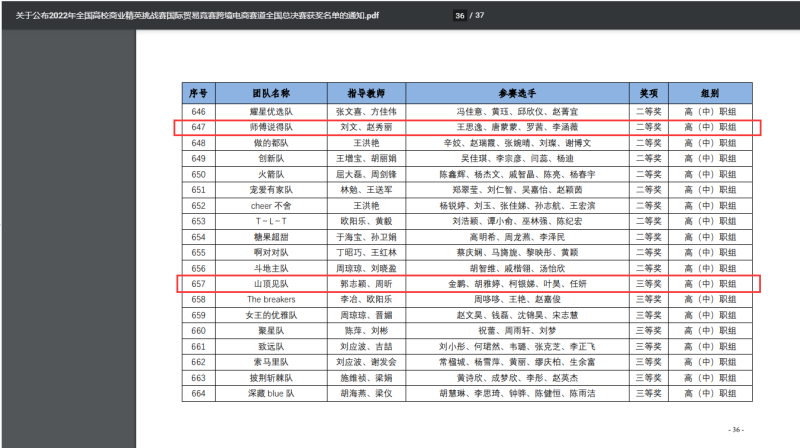新闻网讯(通讯员 刘文 王晓宁)11月5日和7日,2022年全国高校商业精英挑战赛国际贸易竞赛跨境电商赛道全国总决赛在线上成功举办。我院应用外国语学部、财经与商贸学部分别组队参赛,其中应用外国语学部“师傅说得队”在教师刘文、赵秀丽的指导下获得全国高(中)职组二等奖,财经与商贸学部“山顶见队”在教师郭志颖、周昕的指导下获得全国高(中)职组三等奖。