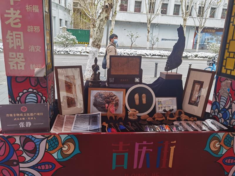 (图为武汉市文化和旅游局的肖局长,到吉庆街巡视,来到武汉木雕展示台,向张静询问关于非遗传承方面的情况)
