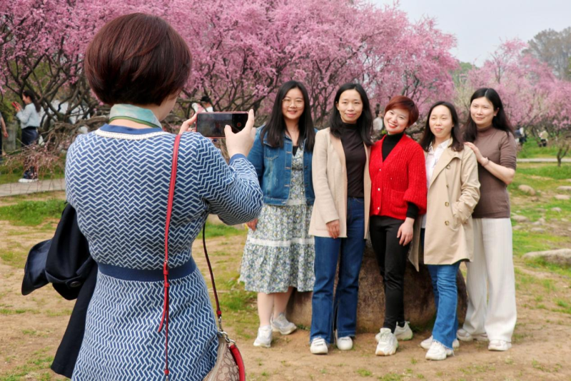 东湖梅园位于磨山景区,是全国四大梅园之一,也是全国著名的赏梅胜地。当日,前来赏梅、咏梅、画梅、摄梅的游客络绎不绝。曼妙春色里,梅花争相盛开,红色、白色、粉色交错绽放,风姿绰约,远远望去层层叠叠,云蒸霞蔚。女教职工们热情高涨,兴致勃勃,或三五成群,或独自徜徉,在踏青赏梅的同时纷纷与灿烂春光争相合影。活动氛围轻松和谐,欢声笑语此起彼伏,处处洋溢着女教职工们的青春和热情。
