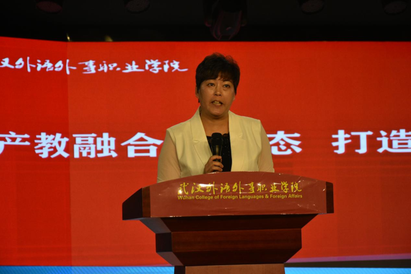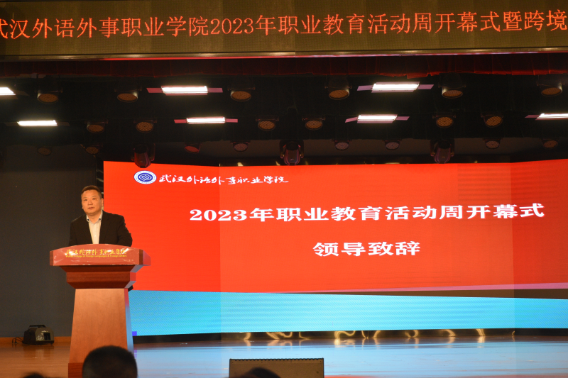 肖军致辞,热烈欢迎莅临学院的各位嘉宾,并预祝学院职业教育活动周圆满成功。他表示,我院是我国中部地区一所专门培养具有外语特长的高级技术型、技能型专门人才的普通高等职业院校,希望各部门、社会各界对职业教育给予更多的投入和关爱,职业教育也将以丰硕的成果回馈行业企业,助力区域经济发展。学院将以此次职业教育活动周为契机,着力打造融合人才培养、社会服务、创新创业等功能于一体的“政校行企社”命运共同体,不断深化现代职业教育体系建设改革,继续深化产教融合,集聚发展要素、夯实人才基础、完善融合体系,形成高效合作机制,切实推进协同育人,促进教育链、产业链、人才链和创新链四链全面贯通、有机衔接,坚持服务导向,赋能学生的全面发展和区域经济社会高质量发展,坚持共同缔造理念,为学生未来美好生活、企业高质量持续发展贡献智慧和力量,为实现第二个百年奋斗目标、实现中华民族伟大复兴中国梦努力奋斗。