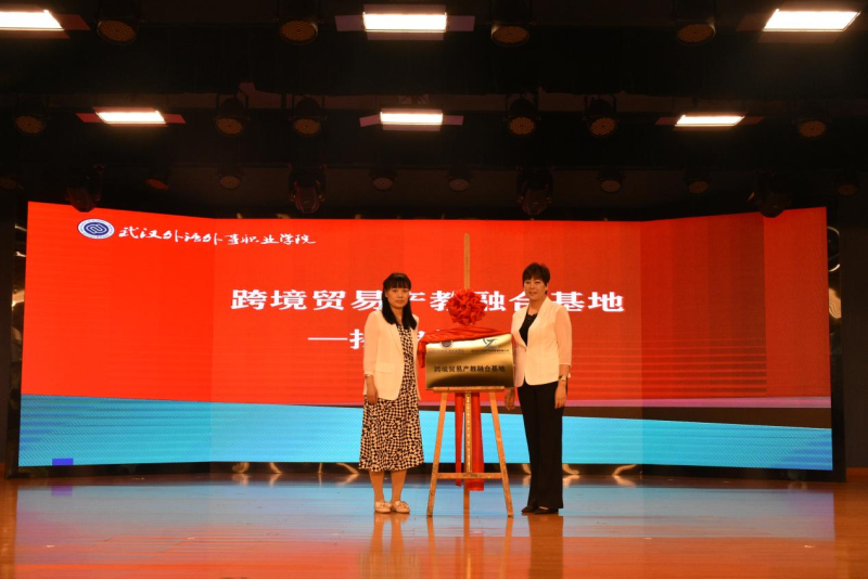 湖北数字创新产业园管理有限公司总经理张君和刘丹共同为跨境贸易产教融合基地揭牌。